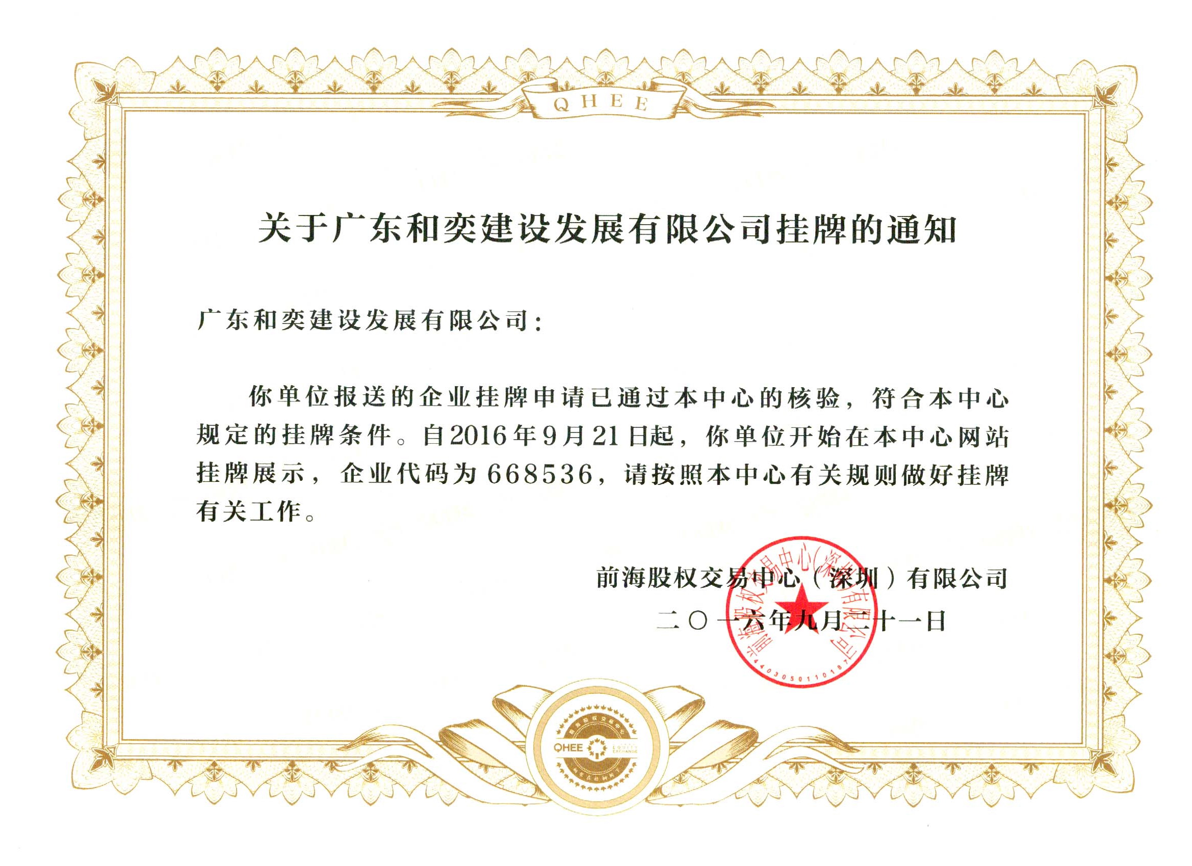 廣東和奕建設發(fā)展有限公司(深圳前海股權交易中心正式掛牌)