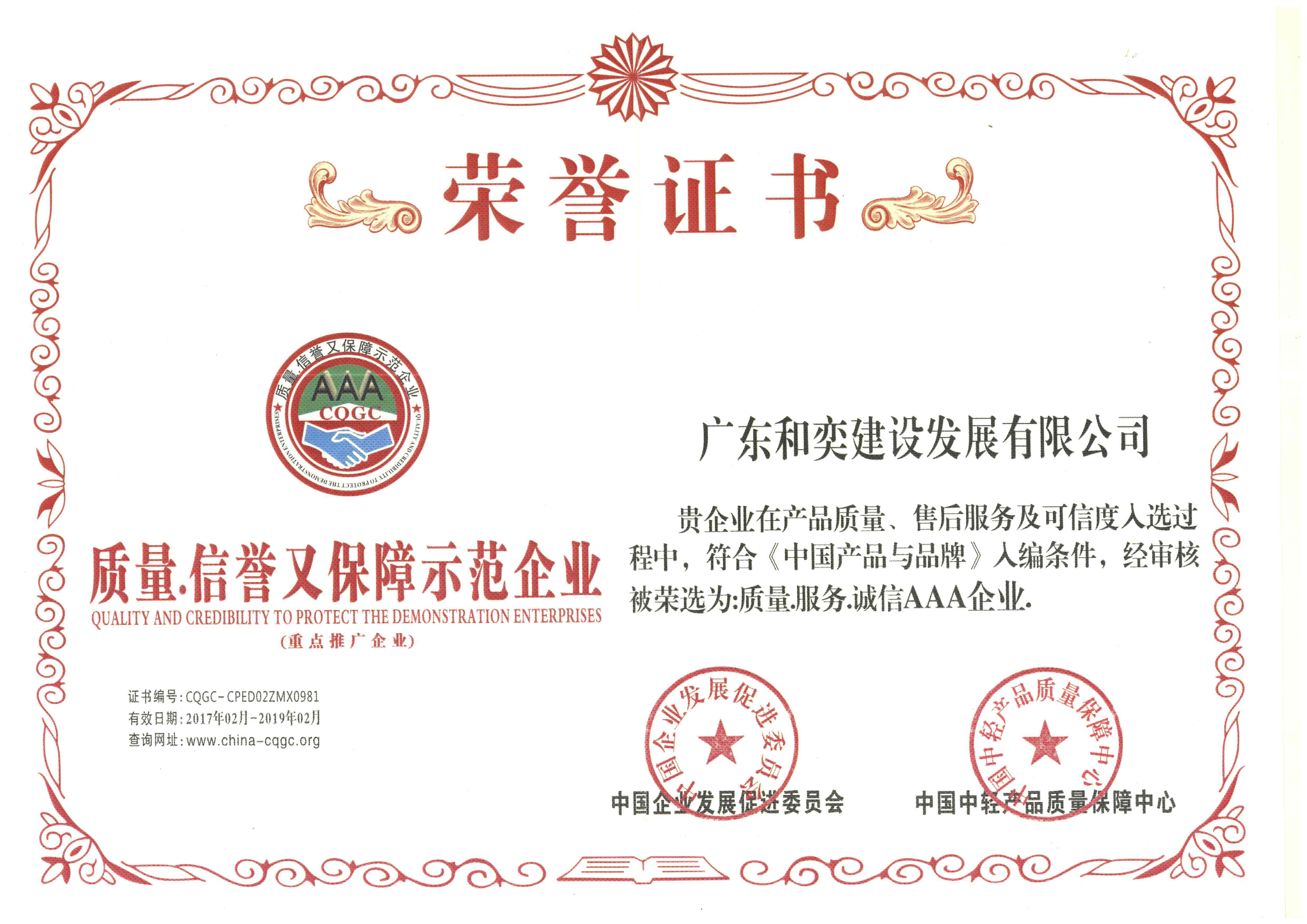 “廣東和奕建設(shè)發(fā)展有限”榮獲《質(zhì)量、信譽保障示范企業(yè)》榮譽證書